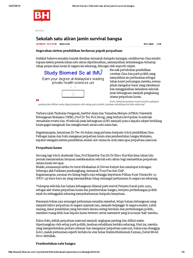 Berita Harian - Sekolah Satu Aliran Jamin Survival Bangsa PDF PDF